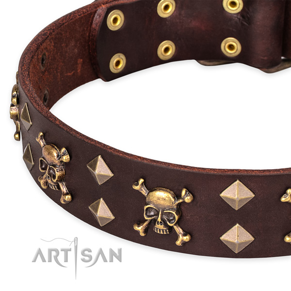 Handy use dog collar of fine quality full grain genuine leather with adornments